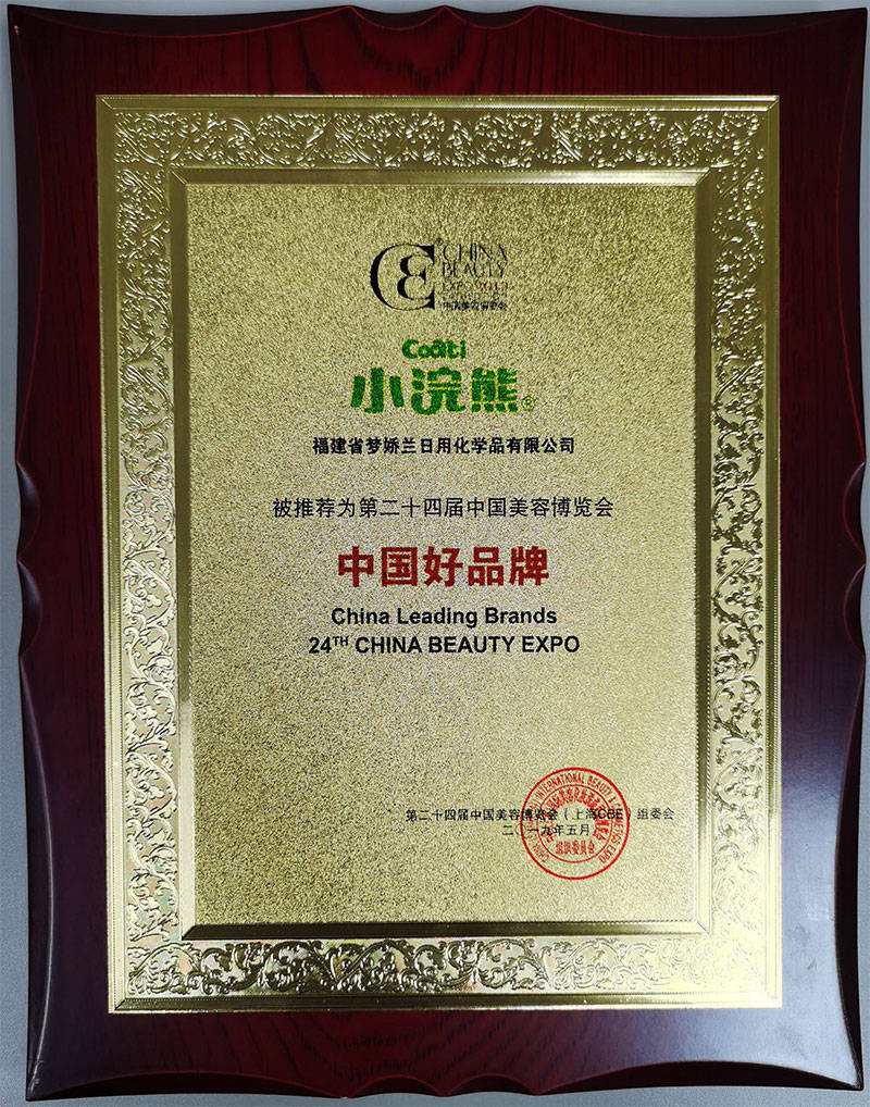 "小浣熊"榮獲【第二十四屆中國美容博覽會(上海CBE)組委會】授予的“第二十四屆中國美容博覽會中國好品牌”殊榮