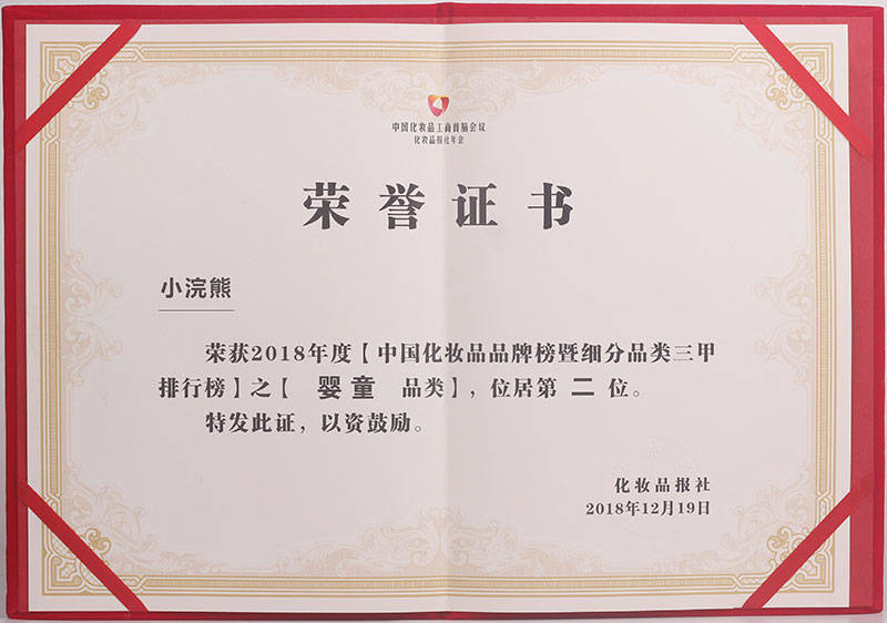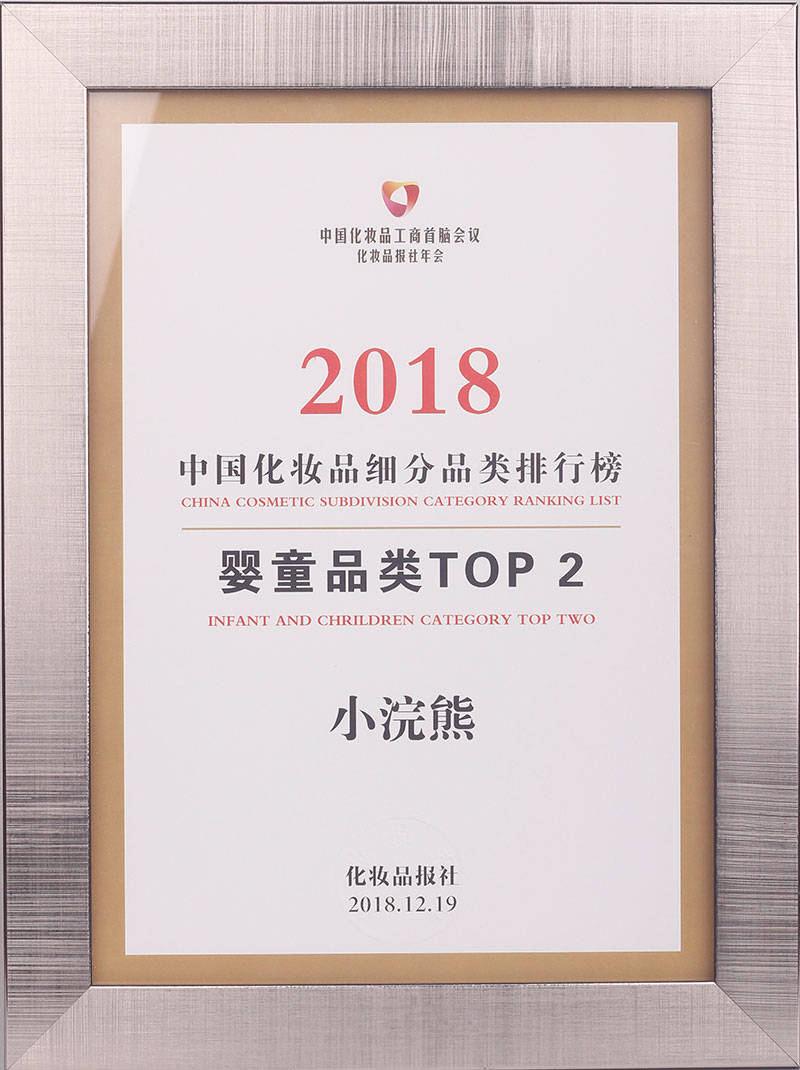 "小浣熊"榮獲【化妝品報社】授予的“2018年度【中國化妝品品牌榜暨細分品類三甲排行榜】之【嬰童品類】第二位”殊榮
