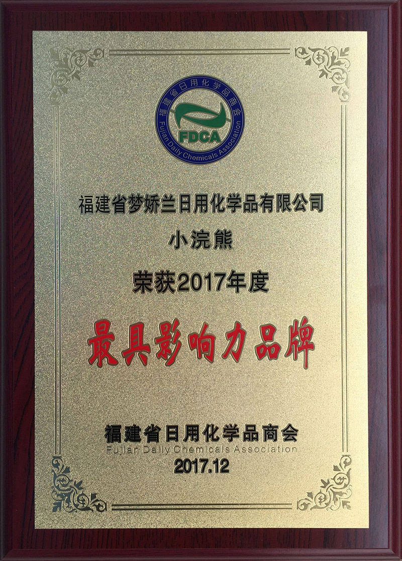 "小浣熊"榮獲【福建省日用化學品商會】授予的“2017年度最具影響力品牌”殊榮