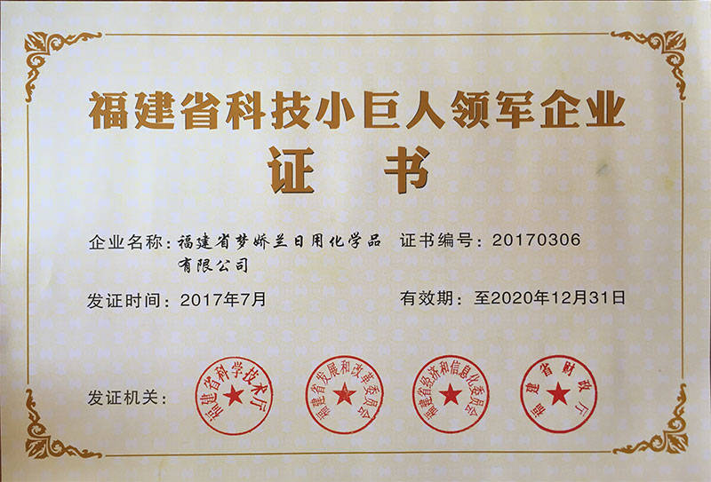 "夢嬌蘭公司"榮獲【福建省科學技術廳等單位】授予的“福建省科技小巨人領軍企業(20170306)”殊榮