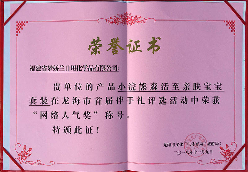 "小浣熊護膚品"榮獲【龍海市文化廣電體育局(旅游局)】授予的“龍海市首屆伴手禮評選活動網絡人氣獎”殊榮