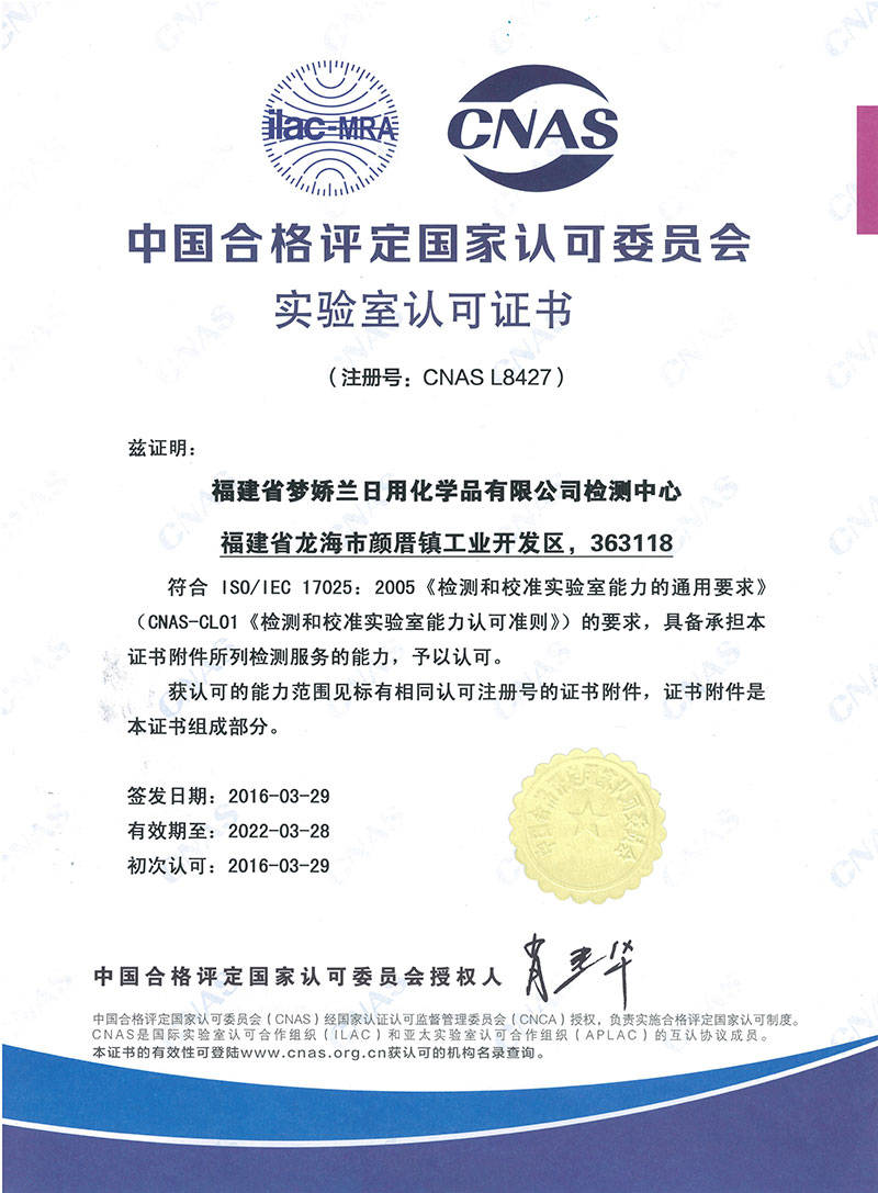 “夢嬌蘭公司檢測中心”首次通過中國合格評定國家認可委員會“CNAS”實驗室認可