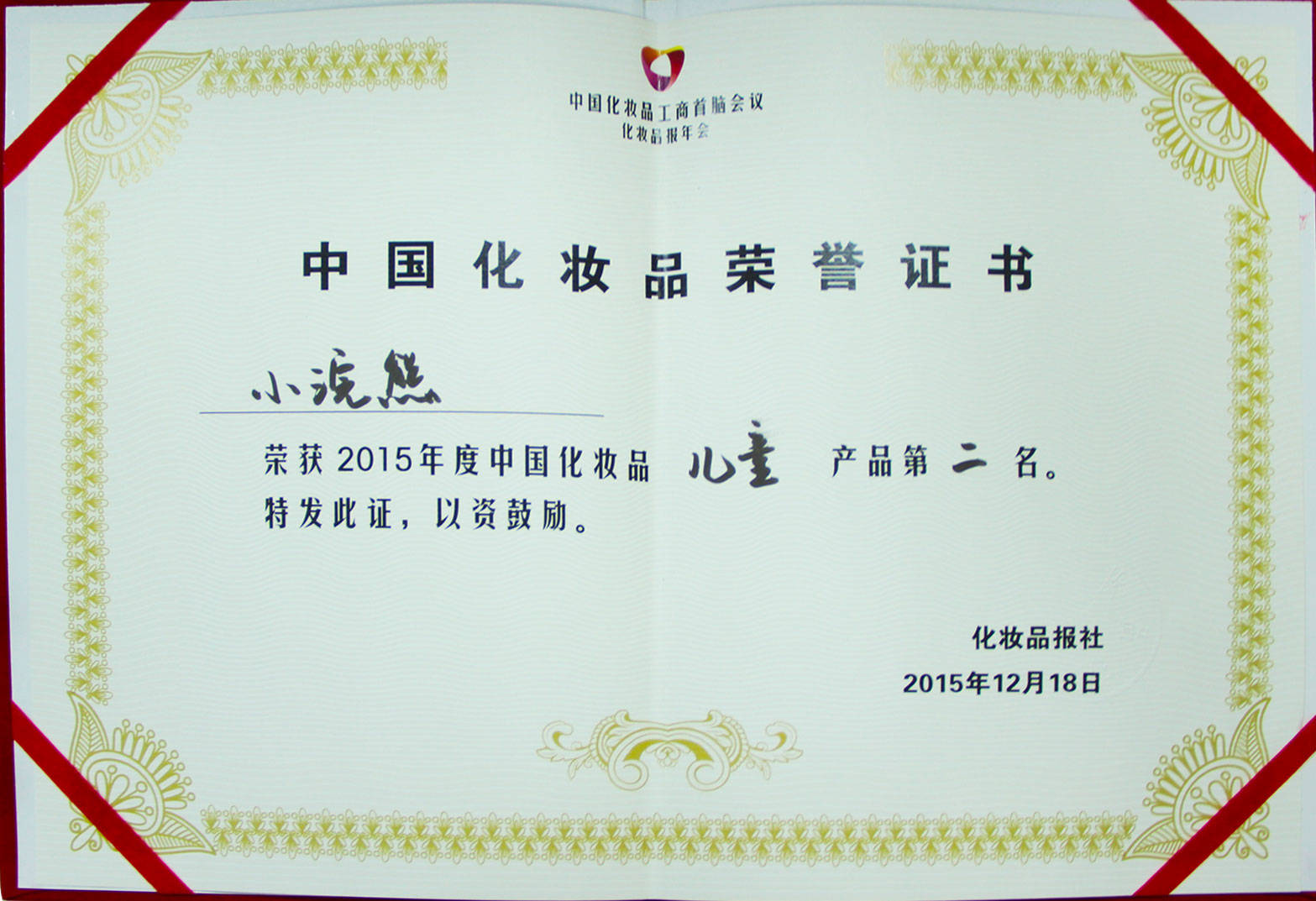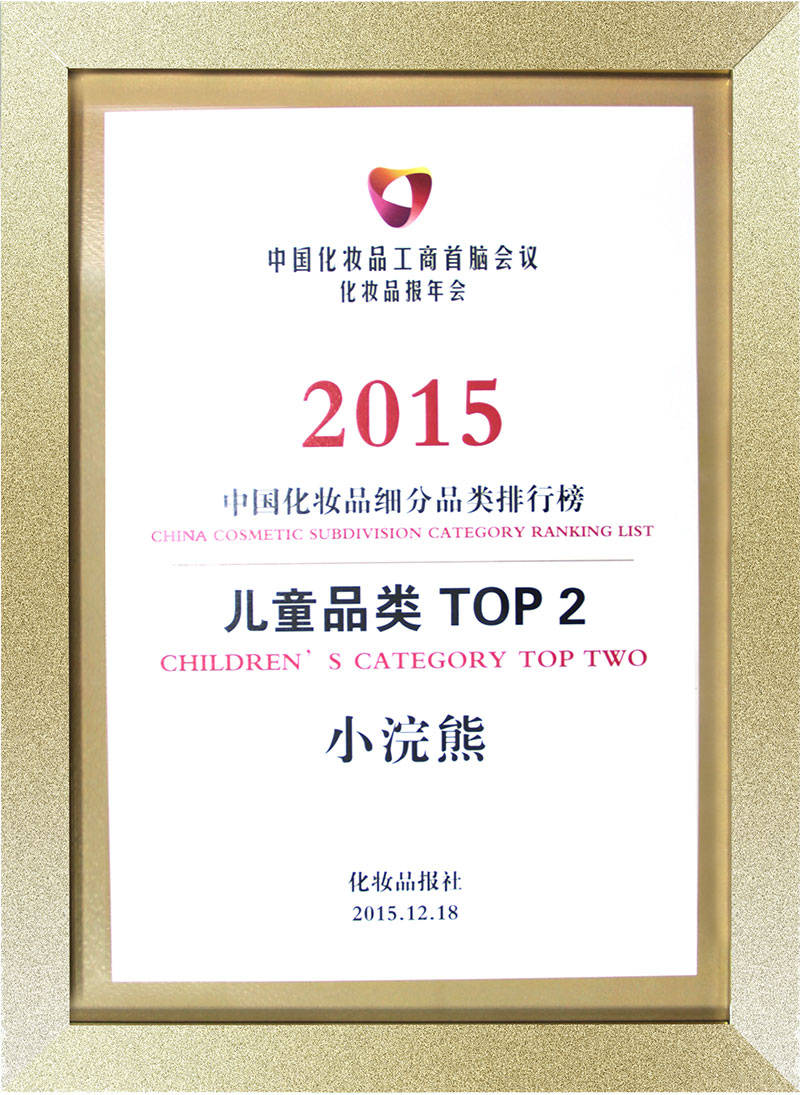 "小浣熊"榮獲【化妝品報社】授予的“2015中國化妝品細分品類排行榜 兒童類TOP2 ”殊榮
