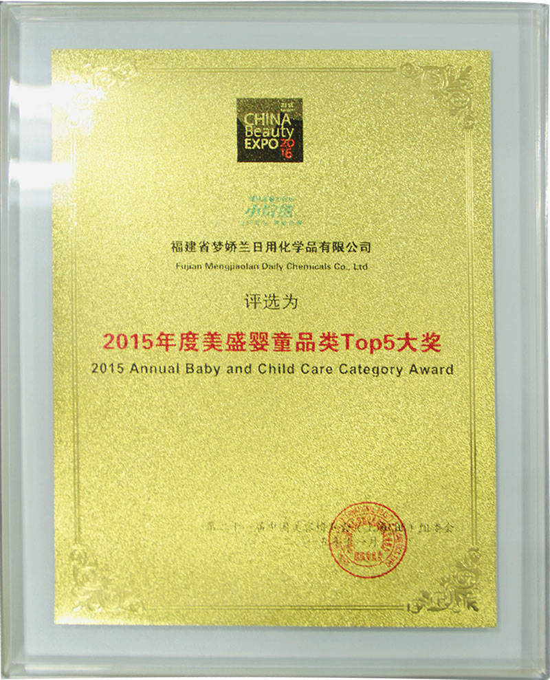 "小浣熊"榮獲【第二十一屆中國美容博覽會(上海BCE)組委會】授予的“2015年度美盛嬰童品類TOP5大獎”殊榮