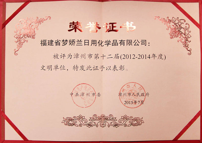 "夢嬌蘭公司"榮獲【中共漳州市委 漳州市人民政府】授予的“漳州市第十二屆(2012-2014年度)文明單位 ”殊榮