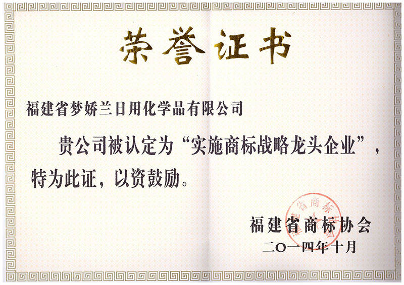 "夢嬌蘭公司"榮獲【福建省商標協會】授予的“實施商標戰略龍頭企業”殊榮
