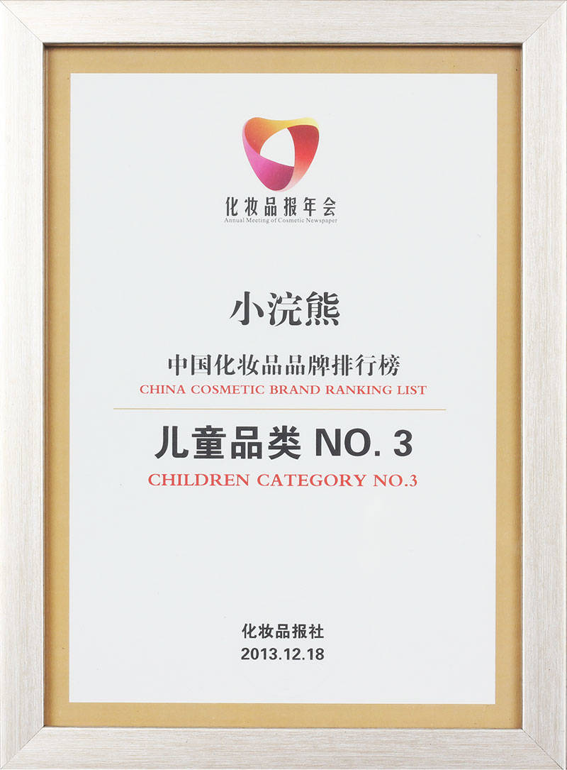"小浣熊"榮獲【化妝品報社】授予的“中國化妝品品牌排行榜兒童品類NO.3”殊榮