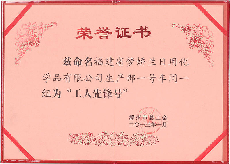 “夢嬌蘭公司生產部一號車間一組”榮獲【漳州市總工會】授予的“工人先鋒號”殊榮