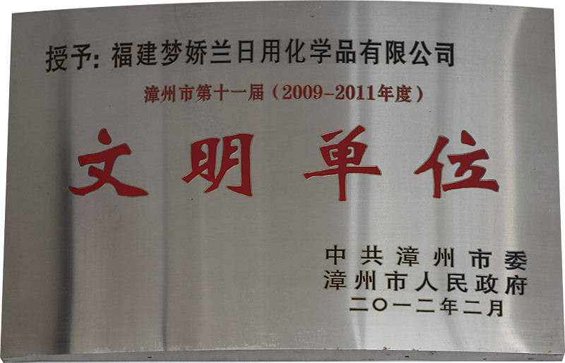 "夢嬌蘭公司"榮獲【中共漳州市委漳州市人民政府】授予的“漳州市第十一屆(2009-2011年度) 文明單位”殊榮