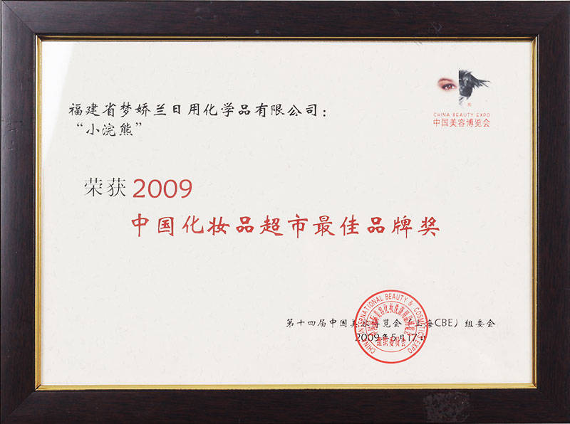 "小浣熊"榮獲【第十四屆中國美容博覽會(上海BCE)組委會】授予的“2009中國化妝品超市最佳品牌獎”殊榮
