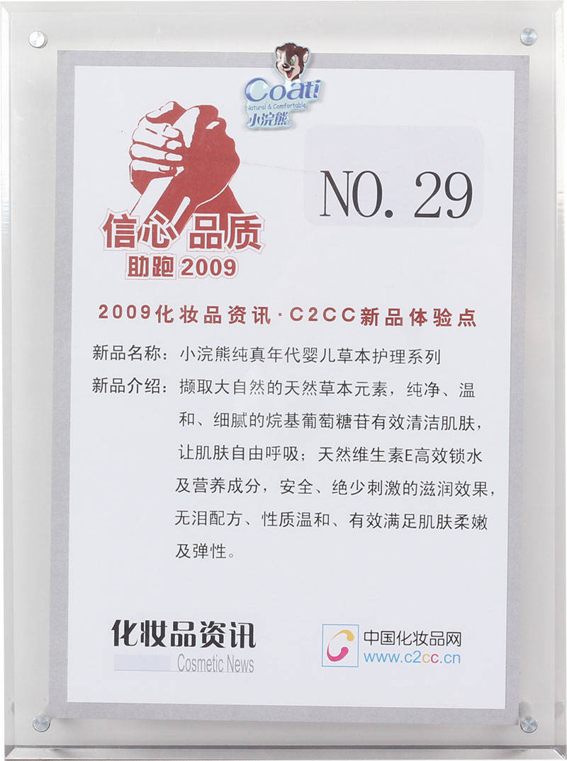 "小浣熊"榮獲【中國化妝品網】授予的“2009化妝品資訊.c2cc新品體驗店NO.29”殊榮