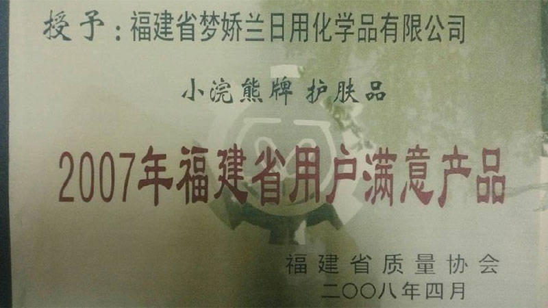 “小浣熊牌護膚品”榮獲【福建省質量協會】授予的“2007年福建省用戶滿意產品”殊榮