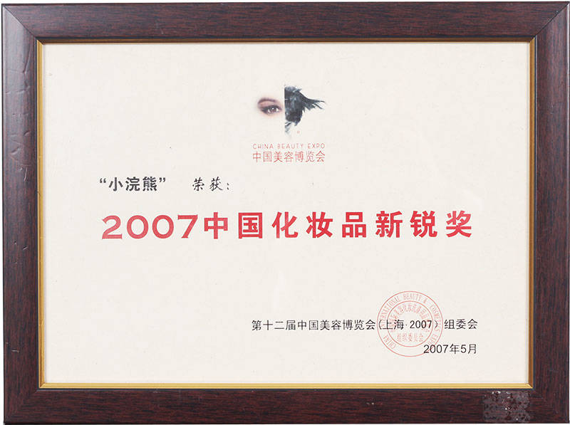 “小浣熊”榮獲【第十二屆中國美容博覽會(上海 2007)組委會】授予的“2007中國化妝品新銳獎”殊榮