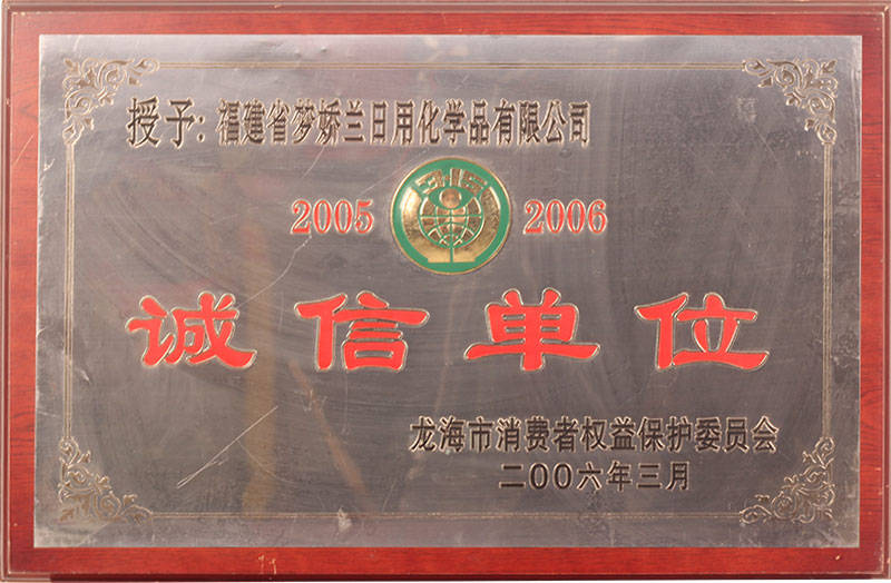 "夢嬌蘭公司"榮獲【龍海市消費者權益保護委員會】授予的“福建省夢嬌蘭日用化學品有限公司2005-2006年度誠信單位”殊榮