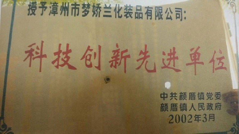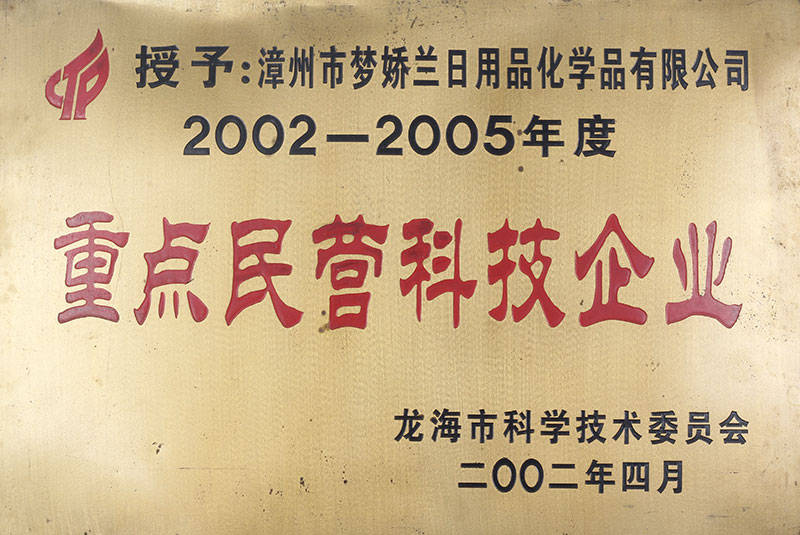 "夢嬌蘭公司"榮獲【龍海市科學技術委員會】授予的“2002-2005年度龍海市重點民營科技企業”殊榮