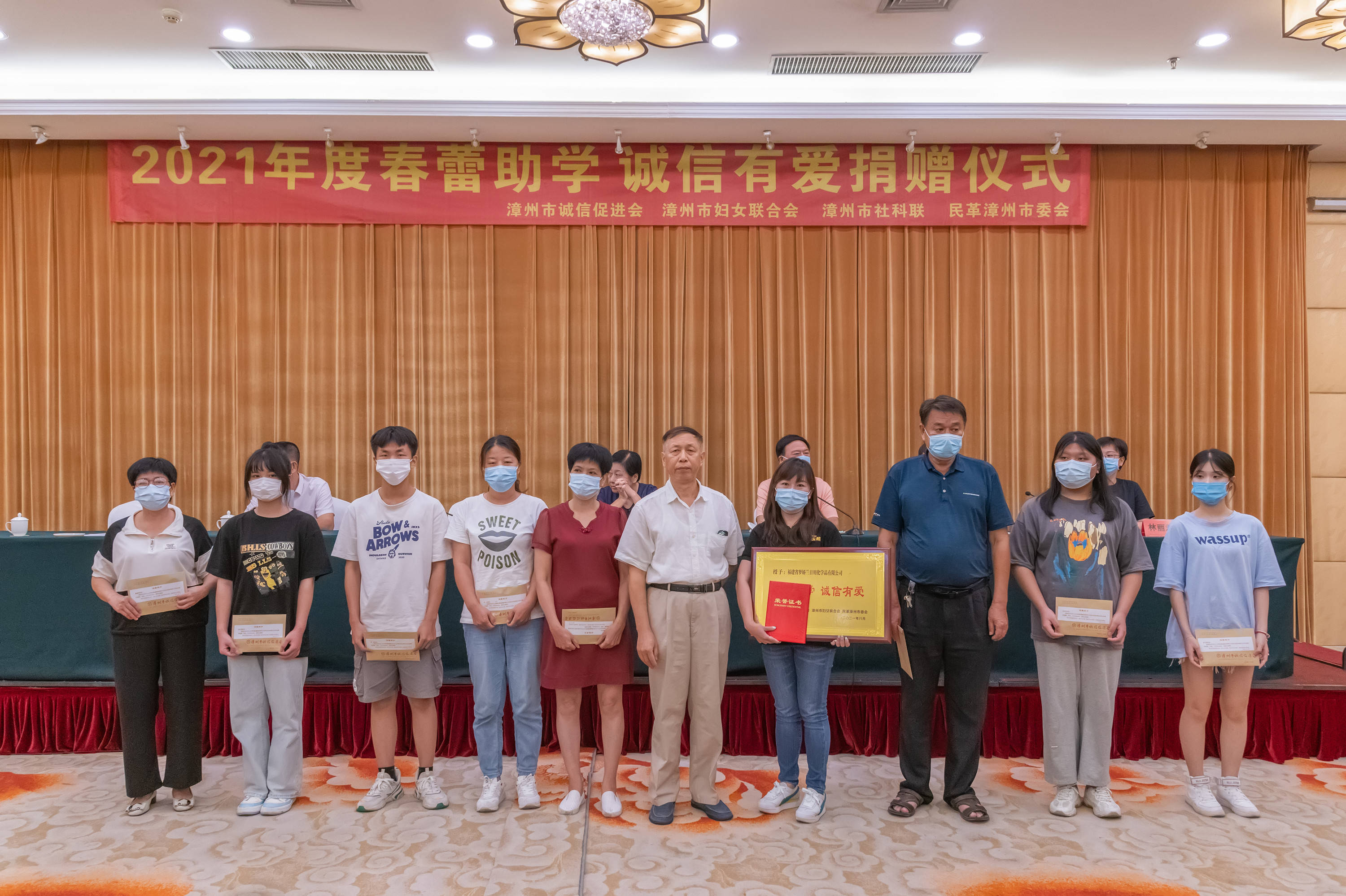 2021年8月31日下午,由漳州市誠信促進會、市婦聯、市社科聯、民革漳州市委會聯合舉辦的2021年度漳州市“春蕾助學 誠信有愛”金秋助學捐贈儀式,在漳州賓館水仙樓國際廳舉行。12家愛心企業資助56名考入高等學府等深造的研究生和大中專貧困學子,愛心企業總資助金額24.3萬元。