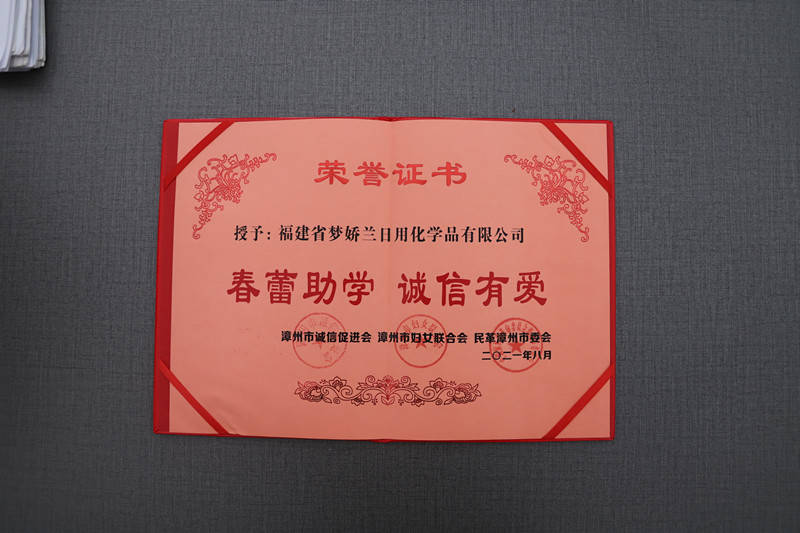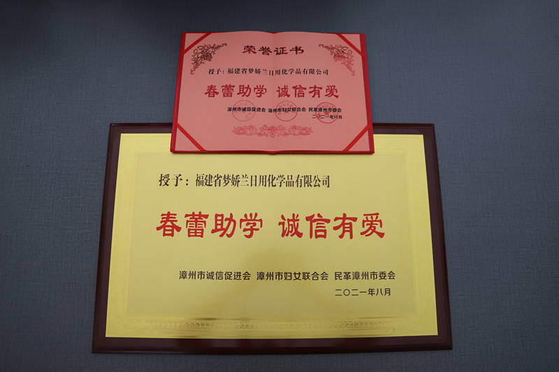 福建省夢嬌蘭日用化學品有限公司自成立以來,始終秉承著“用心打造安全舒適的嬰童護理產品,讓童年更快樂!”的企業使命,在企業發展過程中,始終將關注更多中國青少年兒童的健康成長作為企業所肩負的社會責任,多年來一直熱衷于參與社會愛心資助、助學筑夢等公益活動,本次2021年度漳州市“春蕾助學 誠信有愛”金秋助學活動,我司資助8名貧困學子,祝賀學子們金榜題名,邁向了人生新的階段。祝愿他們早日成才,將來學有所成回報社會。